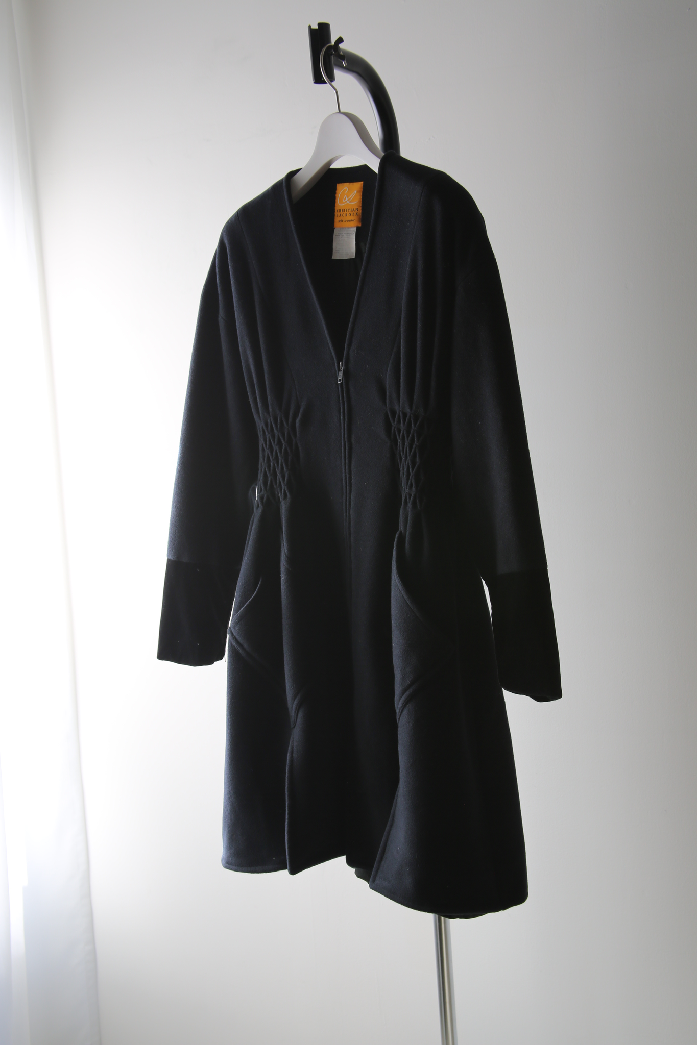 1988 CHRISTIAN LACROIX / SMOCKING EMBROIDERY SHAPED CASHMERE WOOL COAT IN BLACK